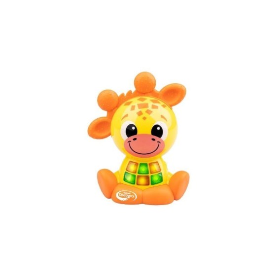 Niewielki rozmiar, bogate wnętrze! Mądra żyrafka uczy maluchy cyferek i śpiewa dwie edukacyjne piosenki. Zwierzak odtwarza aż 25 różnych dźwięków i melodii, z którymi zabawa stanie się jeszcze weselsza! Na brzuszku żyrafy znajdują się przyciski, aktywujące światełko i poszczególne dźwięki. Uszka zwierzaka także wydają odgłos, a jest nim terkotanie, które dziecko usłyszy za każdym razem, gdy przekręci je w prawą lub w lewą stronę.