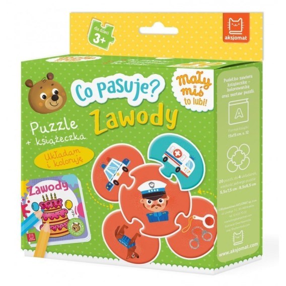 Puzzle służą do ułożenia 4 zestawów obrazków pasujących do danego zawodu. Zabawa polega na skojarzeniu pasujących do siebie rysunków i połączenia ich w całość. Dziecko nazywa zawody wykonywane przez postacie z rysunków oraz przedmioty, które te postacie wykorzystują w swojej pracy. W książeczce znajdują się obrazki do pokolorowania - dziecko utrwala nazwy zawodów oraz ćwiczy rękę, kolorując. Dla dzieci powyżej 3. roku życia.