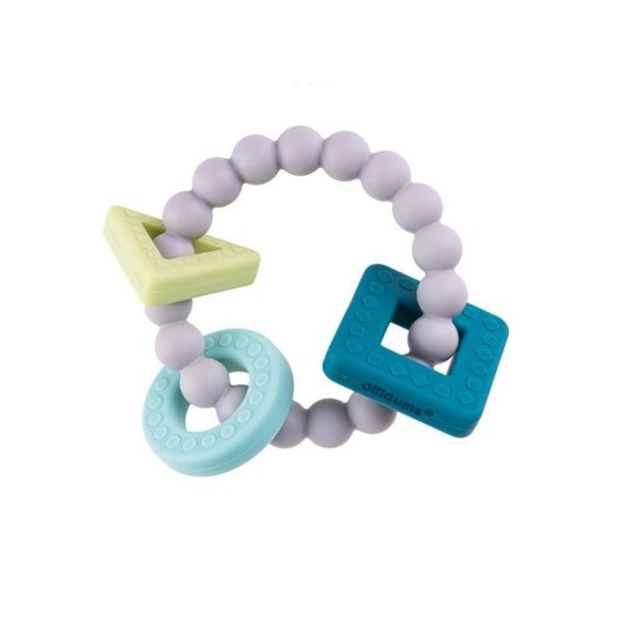 Stylowy, silikonowy gryzaczek - bransoletka z trzema zawieszkami w kształcie figur geometrycznych. Każda z zawieszek posiada inny kolor i fakturę. Zdobią je wypustki, które delikatnie masują dziąsła dziecka, przynoszą mu ulgę w ząbkowaniu. Gryzaczek jest miękki i odporny na zgniatanie.