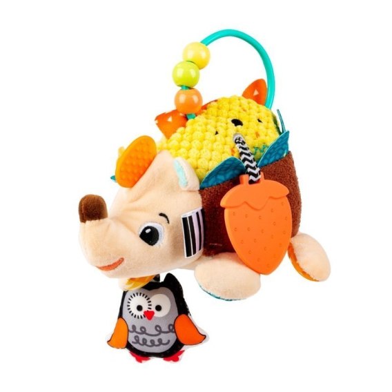 Najeżony sensorycznymi niespodziankami Henio, dostarczy maluchowi wielu powodów do szerokiego uśmiechu! Zwierzak uszyty został z materiałów o zróżnicowanej fakturze, dzięki czemu jego głaskanie stymulować będzie zmysł dotyku dziecka. Doczepiony gryzaczek w kształcie truskawki posiada wypustki, które, podczas gryzienia, masować będą obolałe ząbkowaniem dziąsła bobasa. Zarówno gryzak, jak i znajdująca się z drugiej strony miękka sówka zaczepione są na tasiemce, której przeciąganie pomoże najmłodszym dostrzec zależność przyczynowo - skutkową i stanowić będzie wesołą zabawę. Grzbiet jeża zdobi praktyczny uchwyt z koralikami do przesuwania paluszkiem. Ta milutka zabawka w kolorowym opakowaniu sprawdzi się wyśmienicie na prezent dla małych poszukiwaczy sensorycznych wrażeń.