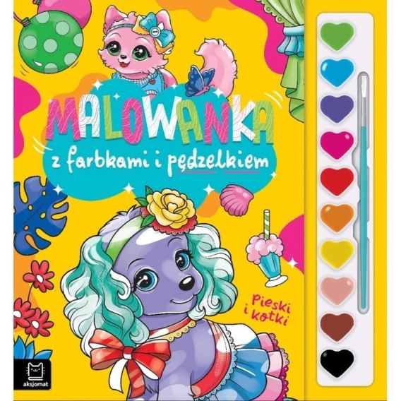 Piękne obrazki, pędzelek i zestaw farbek to propozycja dla małych artystów. Zapraszamy na spotkanie ze wspaniałymi pupilami: pieskami i kotkami - poznaj każdego z nich z osobna. Są tu: Zula, elegancka Stokrotka, lubiąca przyjęcia Czili, odważna suczka Bójka, spokojna kotka Neli, pudelek Chmurka, kicia Błyskotka, strojnisia Amber, kochająca zimę Śnieżynka, Nutka, Psotka Lusia i Gabi. Który zwierzak dba o bezpieczeństwo innych? Która kicia pilnuje włóczek swojej pani? Który pupil chętnie zamieniłby pałacowe życia na zwykłą codzienność? Lubiana przez dzieci tematyka rysunków i ciekawe historyjki o zwierzętach zachęcą dzieci do kolorowania. Malowanki ze zwierzakami to świetna zabawa kolorami, która rozwinie kreatywność i sprawność manualną dziecka. Pozwoli również ćwiczyć cierpliwość i koncentrację. Dołączony do książeczki zestaw 10 kolorów farbek i pędzelek pozwalają dziecku rozpocząć zabawę gdzie i kiedy chce - wystarczy tylko odrobina wody. Baw się kolorami razem ze zwierzętami! Malowanka z farbkami i pędzelkiem to strzał w dziesiątkę!