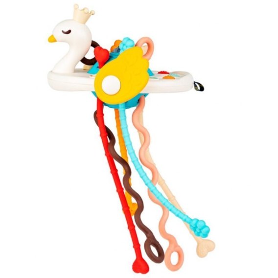 Urocza zabawka, która kryje w sobie niespodzianki, stymulujące zmysł dotyku maluszka! Łabędź wyposażony jest w linki do przeciągania, różniące się kolorem, kształtem i fakturą, skrzydełka z wypustkami, a także kropeczki do wciskania. Kształt zabawki z pewnością przypadnie do gustu młodym poszukiwaczom sensorycznych przygód!
