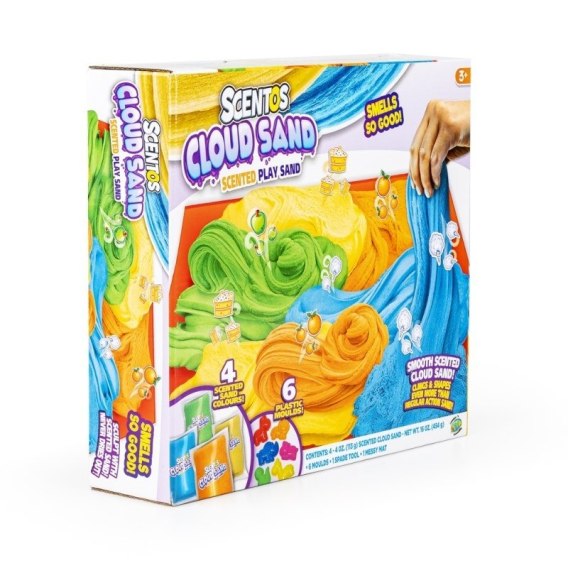 - w zestawie: pachnący piasek puszysty w czterech kolorach, 6 plastikowych foremek, 1 zabawkowa łyżka i 1 mata;
