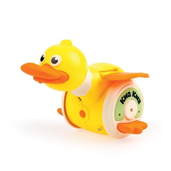 Uwaga maluchy, róbcie miejsce dla Kaczuchy! Jeździ ona wesoło, trzepocząc skrzydełkami, a czynności tej towarzyszy świecenie się kółeczek. Zabawka śpiewa po polsku, ale potrafi także poruszać się bez dźwięku. Kaczuszka posiada wbudowany akumulator, który należy ładować dołączonym do zestawu kablem USB.