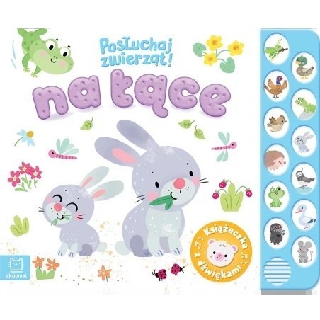 Książeczka z dźwiękami dla małych miłośników zwierząt, a w niej bogate, pastelowe ilustracje odpowiednie dla małych dzieci i krótkie, wpadające w ucho wierszyki o lubianych przez dzieci zwierzakach. Miłą niespodzianką są dołączone dźwięki zwierząt z łąki. Można posłuchać, jakie odgłosy wydają: pasikonik, kaczka, bażant, jaszczurka, przepiórki, zające, jeż, czajka, żaby, bocian, kret, myszy. Naciśnij przycisk z obrazkiem, aby włączyć dźwięk. Chcesz wyłączyć? Naciśnij przycisk jeszcze raz. Zabawa z książką rozwija zmysły malucha. Wesołe i łatwe do zapamiętania wierszyki rozwijają pamięć i percepcję dziecka, które wzbogaca również swoją wiedzę o odgłosy wydawane przez zwierzęta z łąki. Twarda oprawa i kartonowe karty sprawiają, że książka jest trwała i bezpieczna, a format odpowiedni dla małego dziecka. „Posłuchaj zwierząt" to książka do czytania, słuchania i oglądania!