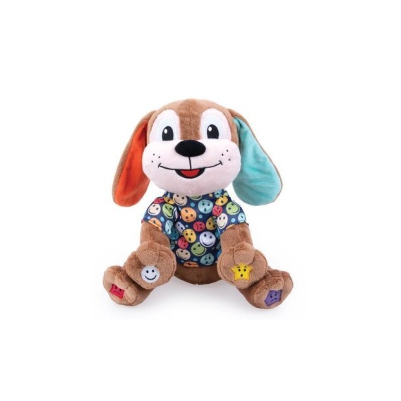 Ten uczuciowy psiak nauczy dzieci rozpoznawania i nazywania emocji! Każda z jego czterech miękkich łapek kryje w sobie inne uczucie, kształt oraz kolor. Naciśnij na jedną z nich, a piesek w przystępny sposób wytłumaczy jak zachowujemy się kiedy czujemy daną emocję, a także do czego można przyrównać kształt kryjący się na łapce oraz kolor. Towarzyszą temu miłe dla ucha piosenki, z pomocą których najmłodszym łatwiej będzie zapamiętać przekazane przez pieska informacje. Zabawka posiada świecące serduszko, a jej łapki wyposażone są w opcję włącz/wyłącz.