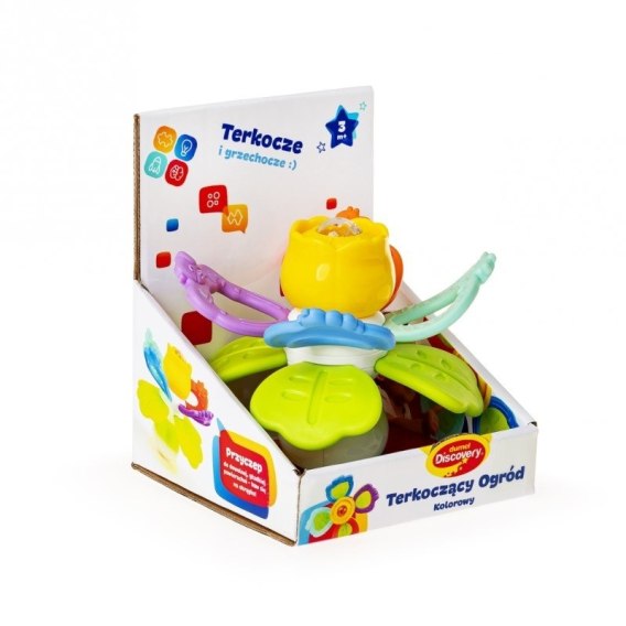 W kolorowym Ogrodzie aż roi się od gryzaczków i zdobiących je zwierzątek! Zabawka składa się z miękkich oraz twardych gryzaków, kwiatka z ukrytą w jego wnętrzu grzechotką, z wesołego terkotka, którego aktywuje przekręcanie względem siebie górnych i dolnych gryzaków, oraz z praktycznej przyssawki. Dzięki niej przymocujesz zabaweczkę do dowolnej, czystej, płaskiej i gładkiej powierzchni, aby zajęła maluszka wesołym przekręcaniem i grzechotaniem w konkretnym miejscu.