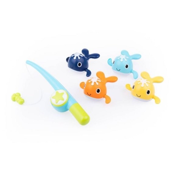 4 uciekające wielorybki, a każdy z nich szybki i uroczy! Po nakręceniu wielorybków pokrętłem znajdującym się na ich brzuszkach i umieszczeniu ich w wodzie, popłyną do przodu, sprawnie wiosłując płetwami. Każdy z nich posiada na głowie magnes, co pozwala złapać je na wędkę, za pomocą magnetycznego robaka! Wędka wyposażona została w ruchomy kołowrotek, który opuszcza i podciąga na lince robaczka. Ten umilacz dziecięcych kąpieli jest nie tylko śliczny, ale też ekonomiczny w użytkowaniu, gdyż kolorowa ferajna wielorybków pływa bez baterii!