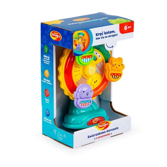 Zakręć kołem karuzeli i włącz się do zabawy! Karuzelka kryje w sobie odgłosy zwierząt, melodie i migające światełka, a dzięki praktycznej przyssawce, można ją przymocować do płaskiej, czystej i gładkiej powierzchni, aby nie przesuwała się w trakcie zabawy. Po naciśnięciu na każde ze zwierzątek, maluch usłyszy jego odgłos oraz melodię. Funkcja regulacji głośności umożliwia dostosowanie zabawki do indywidualnych potrzeb.