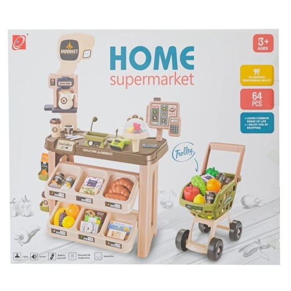 Supermarket wyposażony jest w wiele produktów, skaner wydający dźwięk " pikania", obrotową imitację ekranu kasy fiskalnej oraz zabawkowy kalkulator.