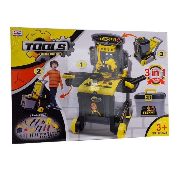 Stolik-wózek z kuferkiem - warsztat dla najmłodszych majsterkowiczy. Zapewni dziecku wiele godzin rozrywki i rozwinie u niego koordynację wzrokowo-ruchową oraz abstrakcyjne myślenie. Pozwala na zabawę dziecka z rodzicem. Stolik po złożeniu może być wózkiem. Zestaw zawiera duży kuferek, do którego można spakować wszystkie akcesoria.