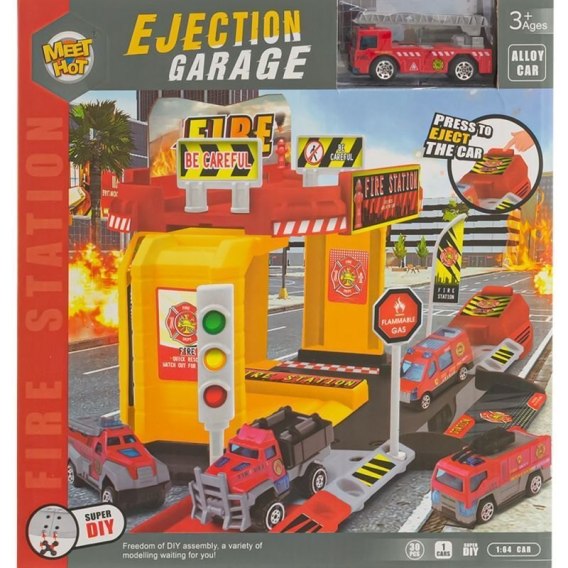 Zestaw zawiera remizę strażacką z wyrzutnią na małe pojazdy, którą można zamontować z boku budynku.