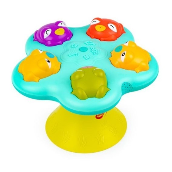 Zostań dyrygentem uroczej, żabiej orkiestry! Naciskaj żabki, aby bawić się razem z nimi, przy wesołych dźwiękach, kolorowych światełkach i zróżnicowanych strumieniach tryskającej wody! Zapomnij o nudzie, każda z żabek zna inną melodię, dzięki czemu zabawa z nimi to prawdziwa frajda. Aby uruchomić zabawkę, należy długo przytrzymać okrągły przycisk, znajdujący się na środku. Po uruchomieniu, każde kolejne, pojedyncze naciśnięcie guziczka spowoduje zmianę sposobu wytryskiwania wody. W zestawie poza fontanną, przypominającą staw, wypełniony żabkami, znajdziesz także przyssawki do przymocowania zabawki do gładkiej, czystej powierzchni.