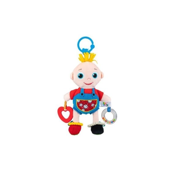 Bobas dla bobasa! Wesoła, materiałowa lalka w kształcie małego chłopczyka to zawieszka, która towarzyszyć może dziecku w dowolnym miejscu, zarówno na spacerze, jak i w domowym zaciszu. Zabawka kryje w sobie wiele niespodzianek. Zdobią ją gryzaki oraz grzechotka, a sam materiał, z którego została wykonana, odznacza się zróżnicowanymi fakturami, które stymulować będą zmysł dotyku dziecka. Praktyczna zawieszka pozwoli przyczepić lalkę w dowolnym miejscu.
