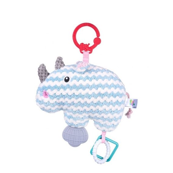 Pastelowy koleżka, w którym z pewnością zakocha się niejeden bobas! Nosorożec wyposażony jest w 3 gryzaczki, które przyniosą ulgę obolałym dziąsłom ząbkującego malucha. W zabawce kryje się dzwoneczek, dzięki czemu zwierzak wydaje wesoły dźwięk przy potrząsaniu. Wykonany z fakturowanego materiału Nosorożec, stymuluje zmysł dotyku i wzroku dziecka, a jego stonowane kolory nadają mu niepowtarzalnego charakteru. Praktyczny uchwyt pozwoli przymocować zabawkę w wybranym miejscu.