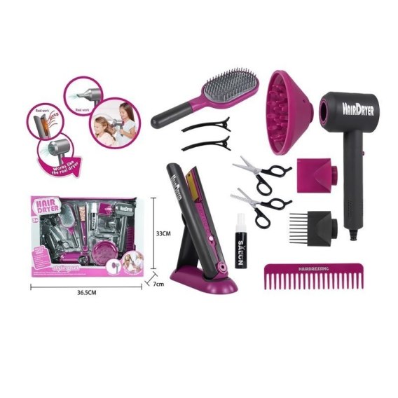 Efekty dźwiękowe i nasadki: Zestaw został wzbogacony o realistyczne efekty dźwiękowe, które naśladują pracę prawdziwych narzędzi fryzjerskich. Suszarka posiada nasadki, a prostownica również jest wyposażona w akcesoria, które pozwolą na różnorodne stylizacje. Dzięki nim dziecko poczuje się jak prawdziwy fryzjer!